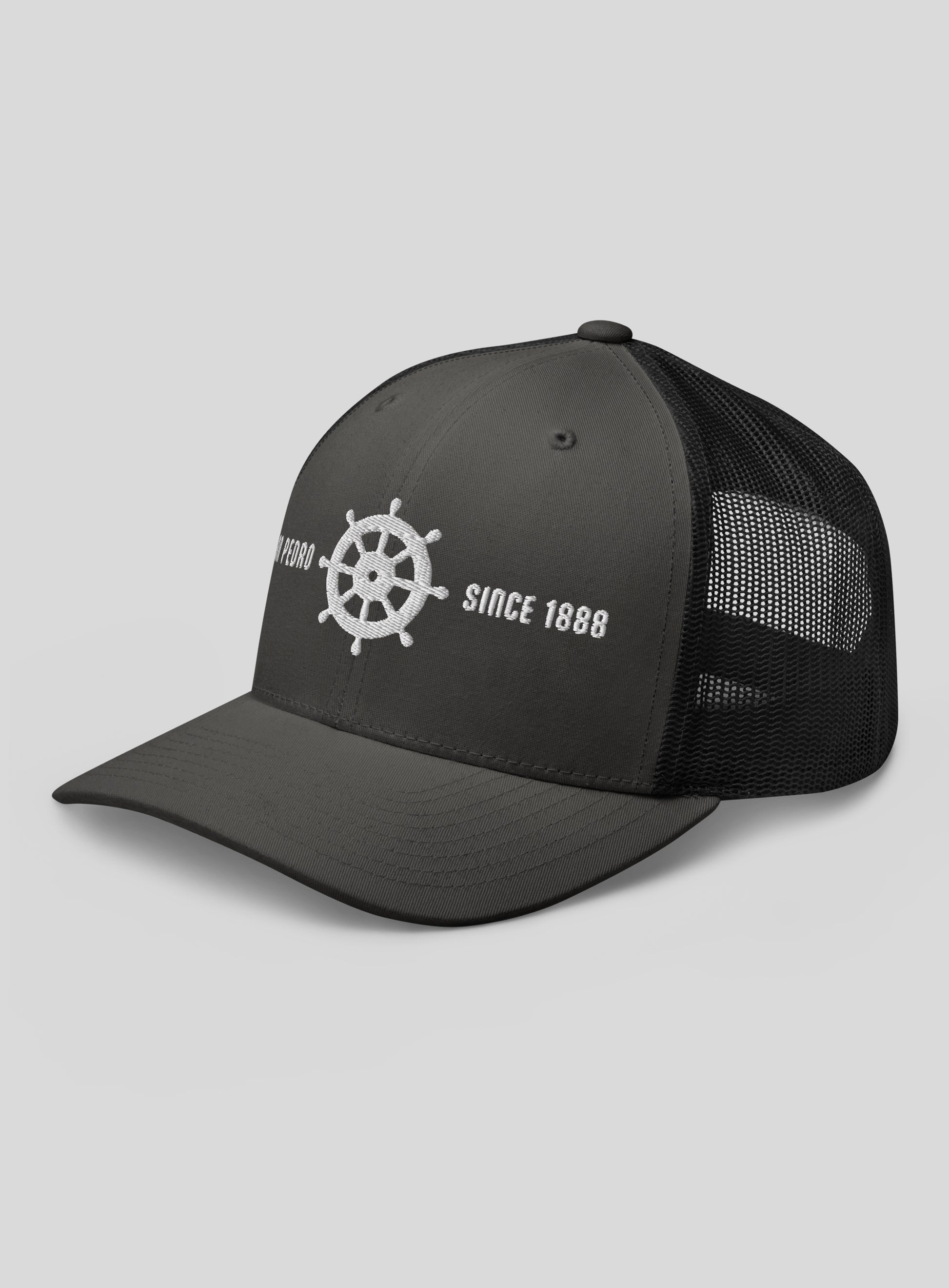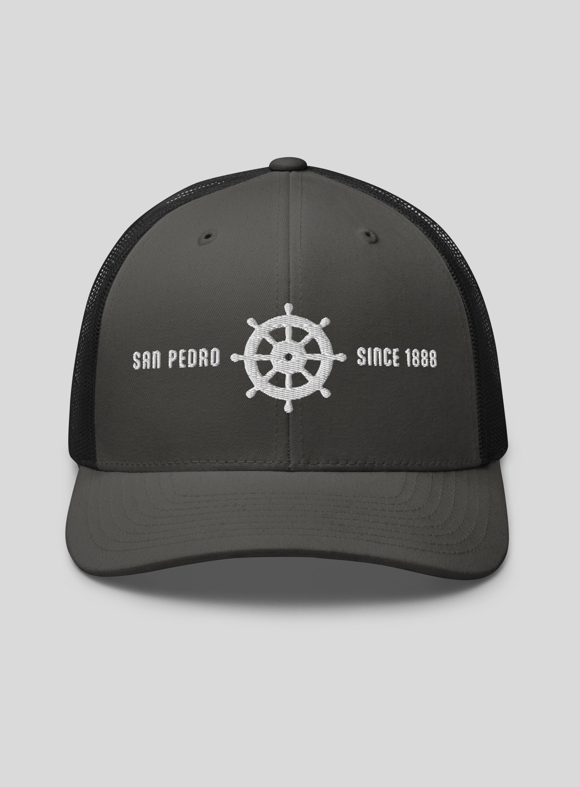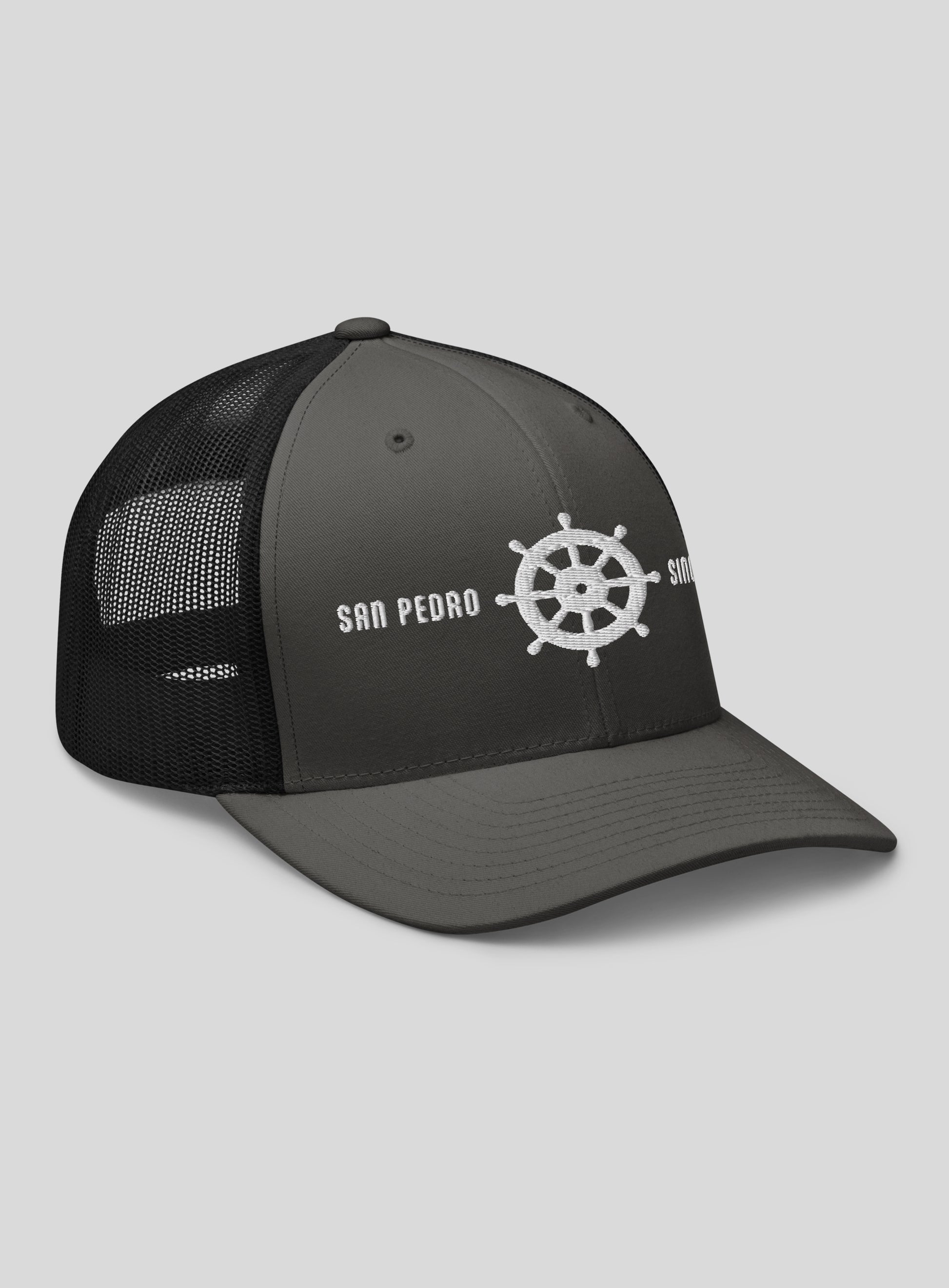 Set sail in everyday style with the San Pedro Helm Trucker Hat in Charcoal and Black. Featuring a clean embroidered ship’s wheel and a nod to San Pedro’s deep harbor roots, this hat blends coastal heritage with laid-back comfort. Breathable mesh backing and an easy snapback make it perfect for dock days, beach strolls, and post-surf tacos.