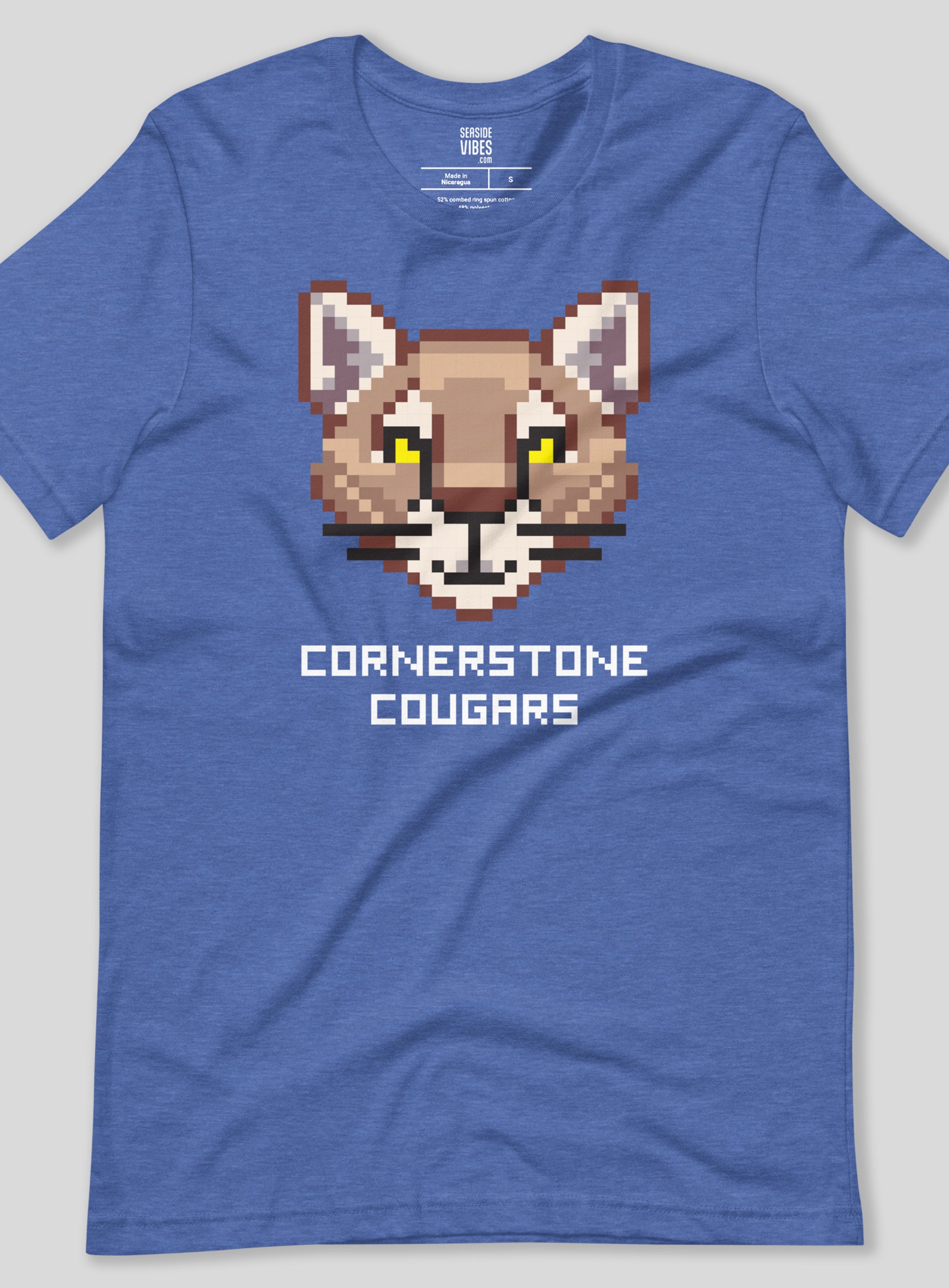 Rep your school spirit with the Cornerstone Cougars Elementary Quest Tee! Featuring a bold pixel-art cougar graphic and retro-inspired lettering, this super-soft blue tee brings a fun, game-ready vibe to everyday wear. Perfect for students, parents, and fans alike, it’s a must-have for showing Cougar pride in style.