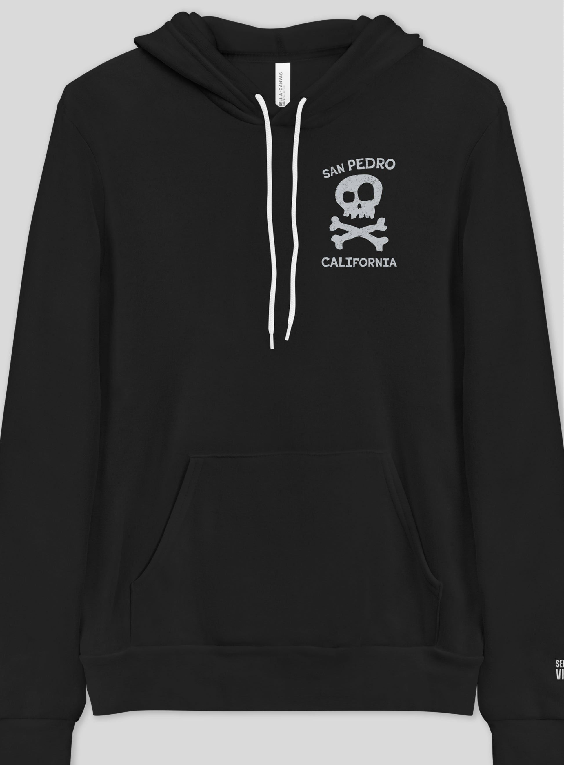 Show off some pirate pride with this bold San Pedro Skull and Bones Pullover Hoodie. Featuring a weathered skull-and-crossbones graphic and vintage-style lettering, it’s equal parts coastal cool and rebellious spirit. Perfect for breezy beach nights or cruising the harbor with attitude.