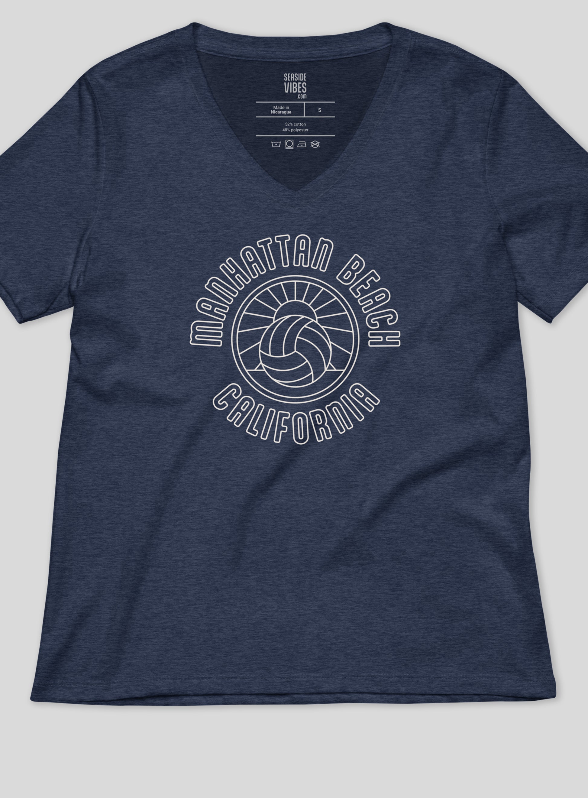 V-Neck: Manhattan Beach Volleyball Sunset Tee - Heather Navy